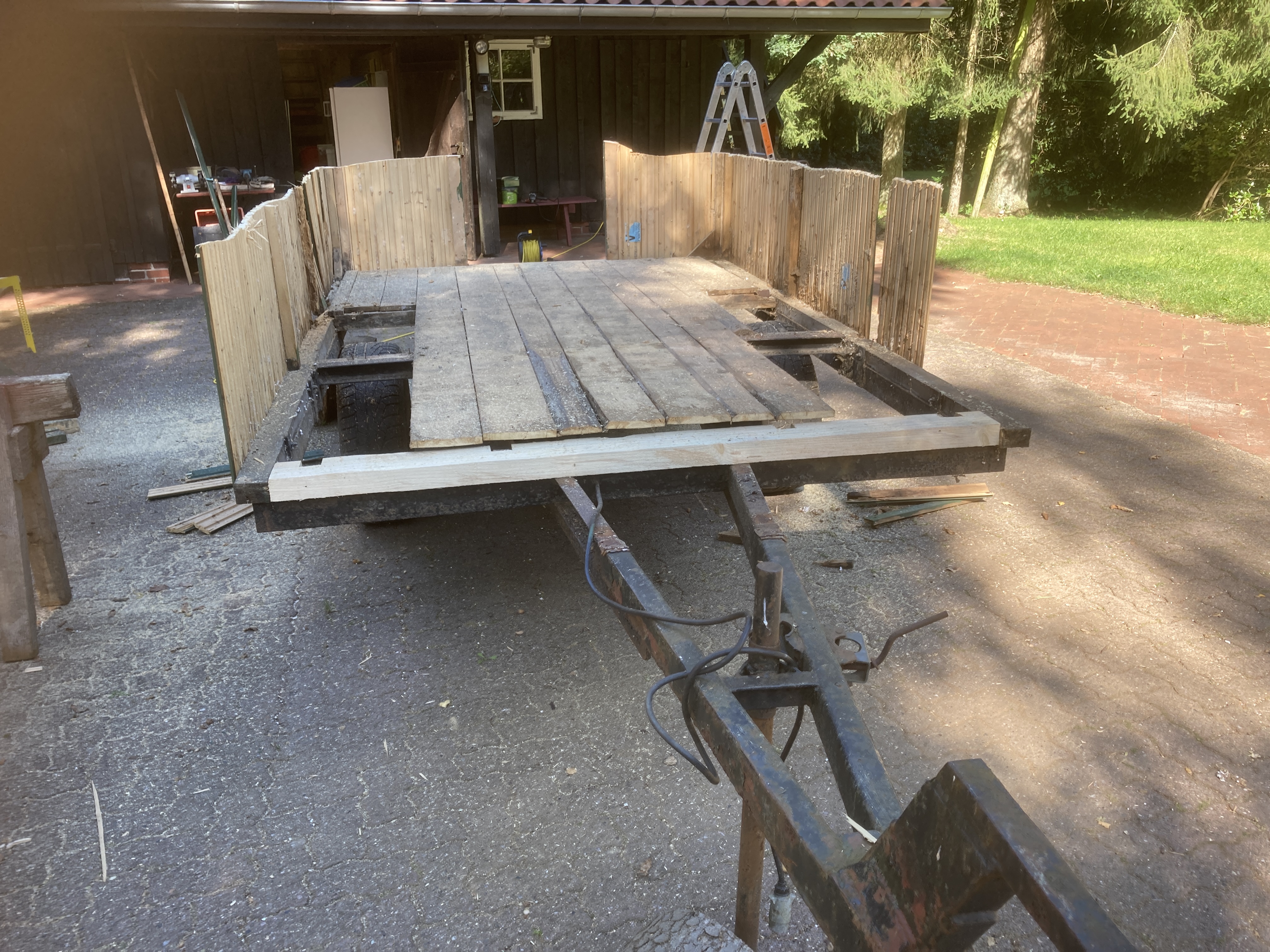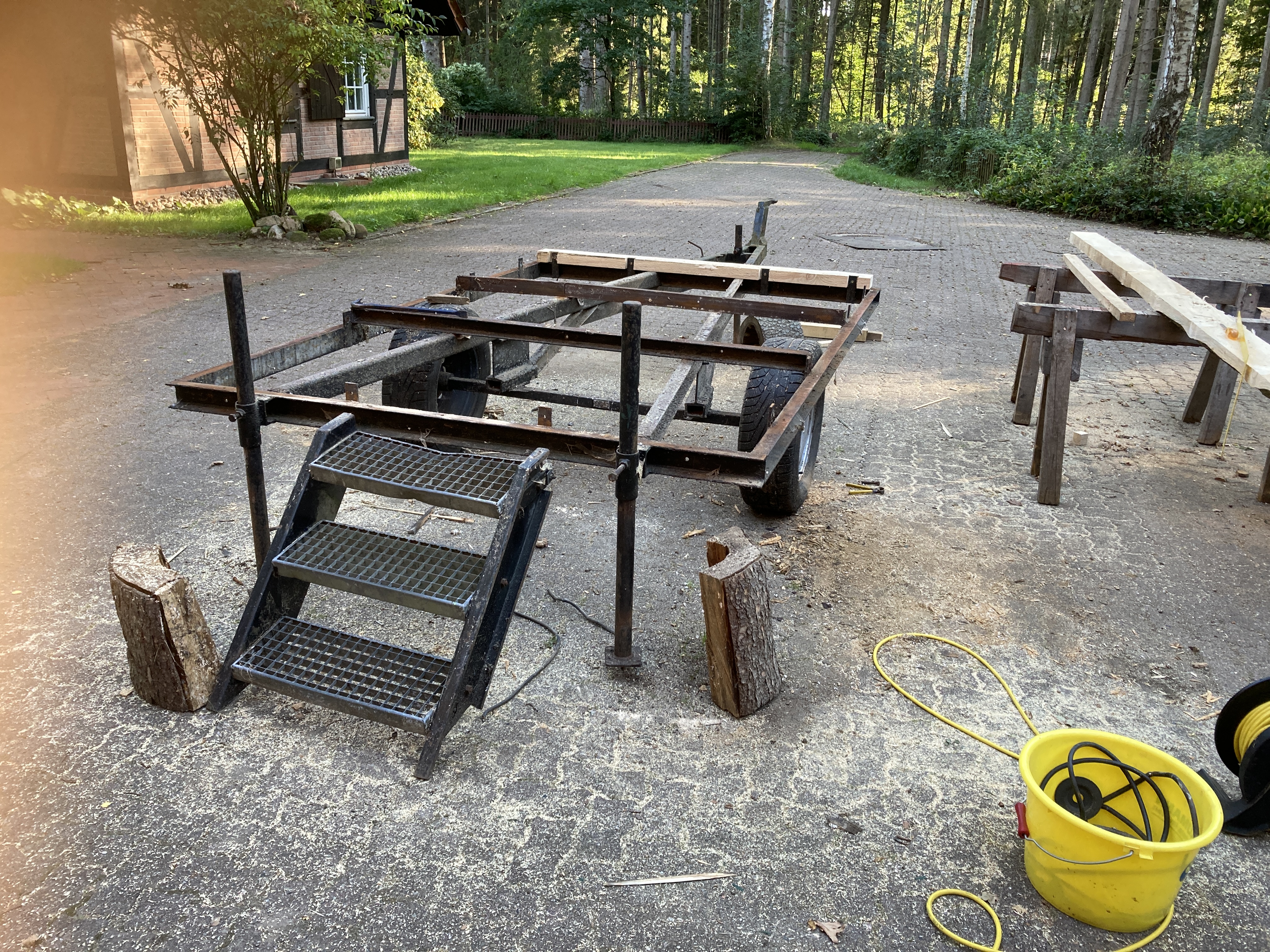 Doch nach der Ankunft im Heide-Häuschen wurde schnell klar: Eine Entkernung und "Renovierung" reichte hier nicht aus. Der  Wagen war insgesamt marode, eine "Reparatur" wäre zwar möglich gewesen, aber sehr mühevoll, und sie hätte am Ende kein wirklich befriedigendes Ergebnis erbracht. Also: Abriss! Der Bauwagen wurde in der Mitte durchgesägt und entsorgt. Am Ende stand da nur noch das Basisgestell aus Stahl mit Radachse und Deichsel.