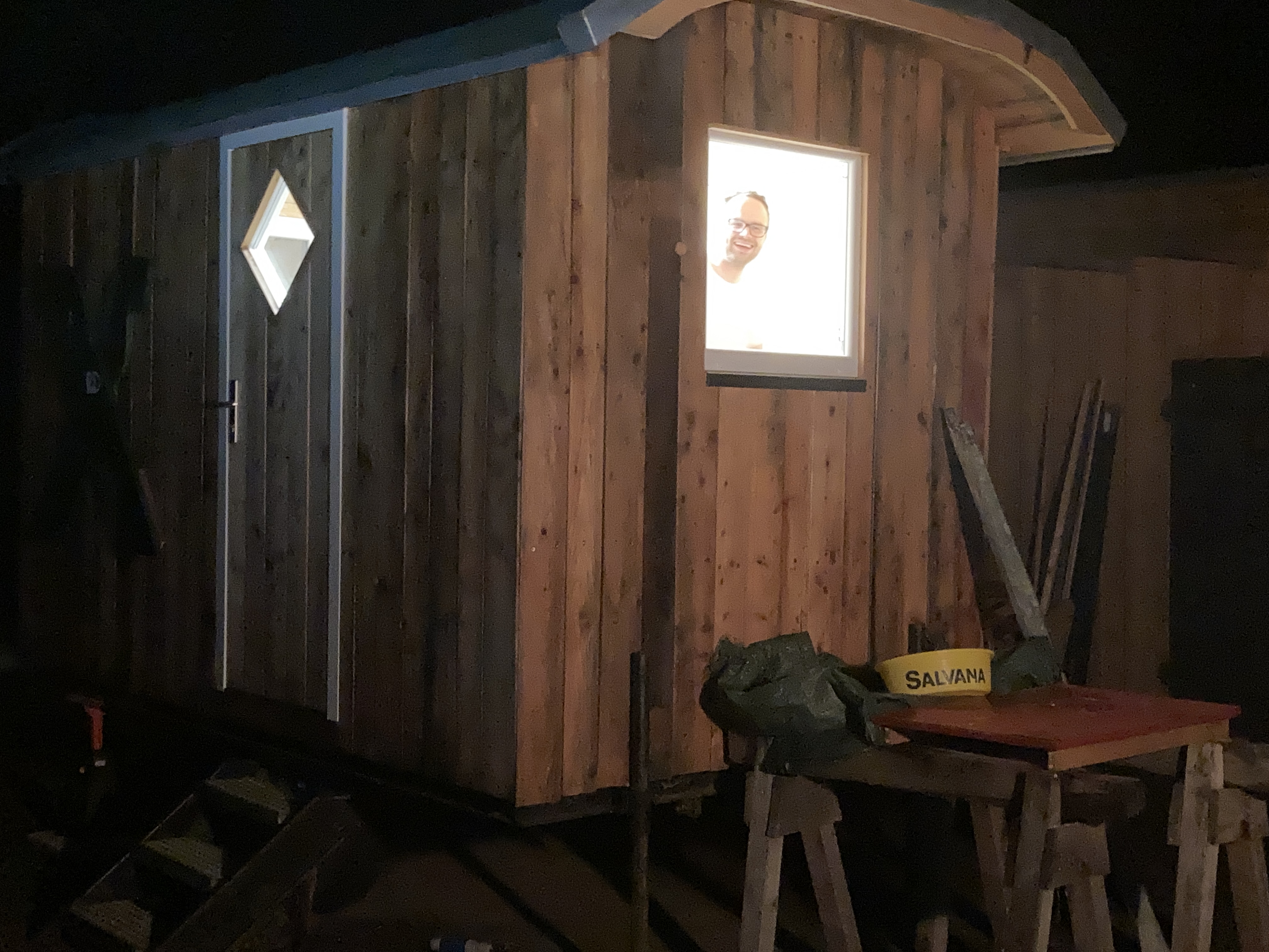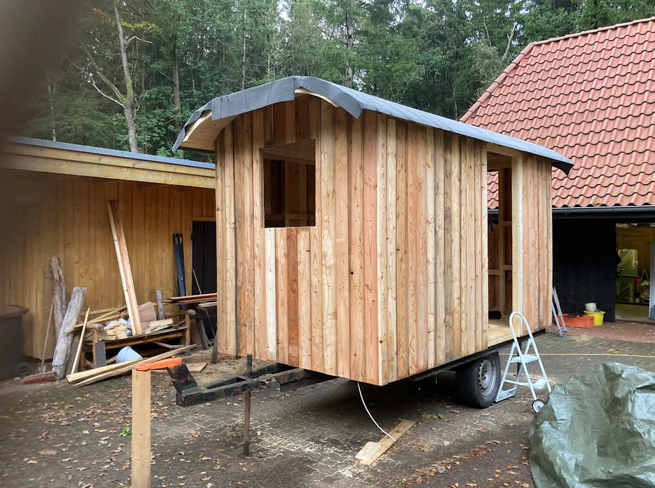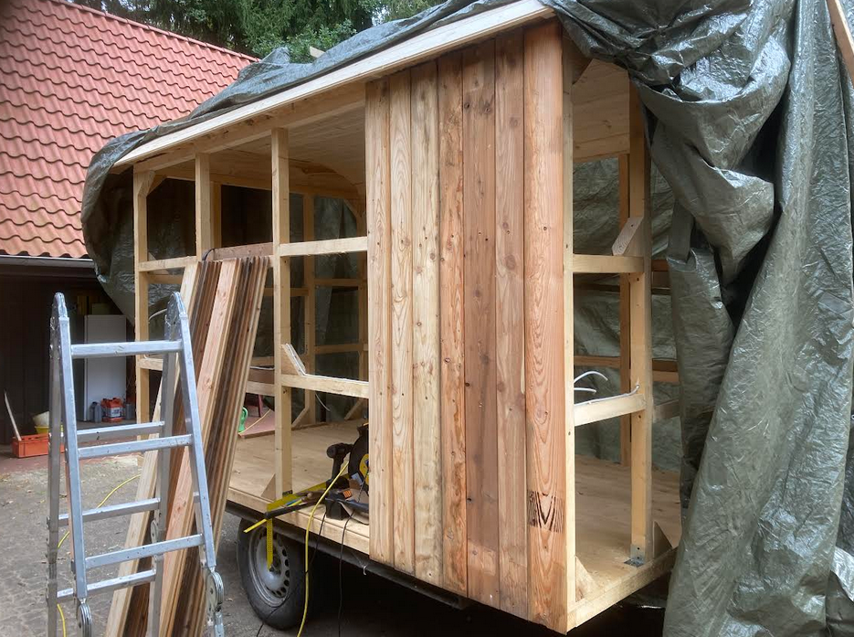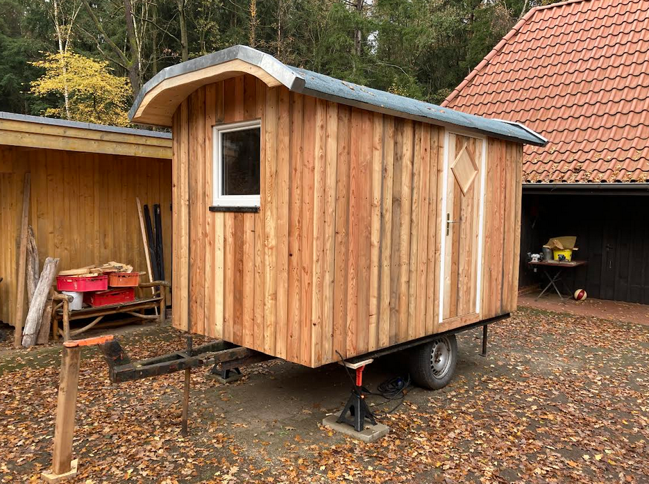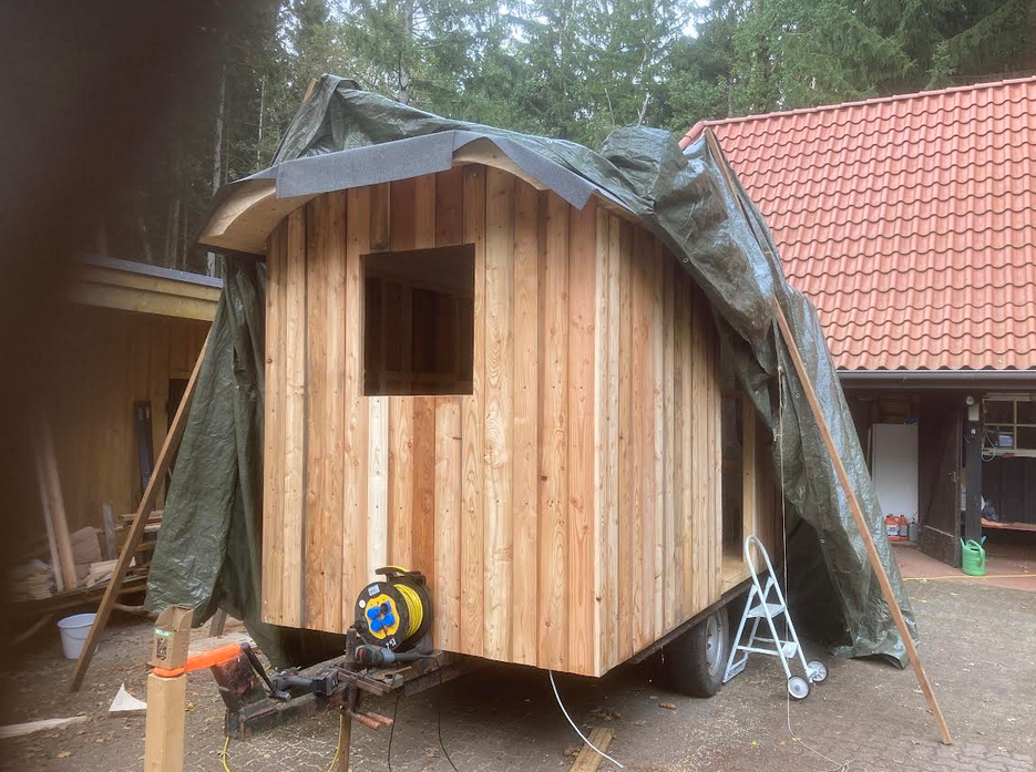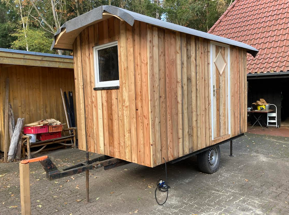 Kleine Anmerkung, um ehrlich zu bleiben: Die Fenster sind natürlich nicht selbst gebaut, sondern von OBI, die Tür hat unser Freund Jürgen maßgeschneidert, und beim Dach hat die Firma Stelter aus Müden geholfen.