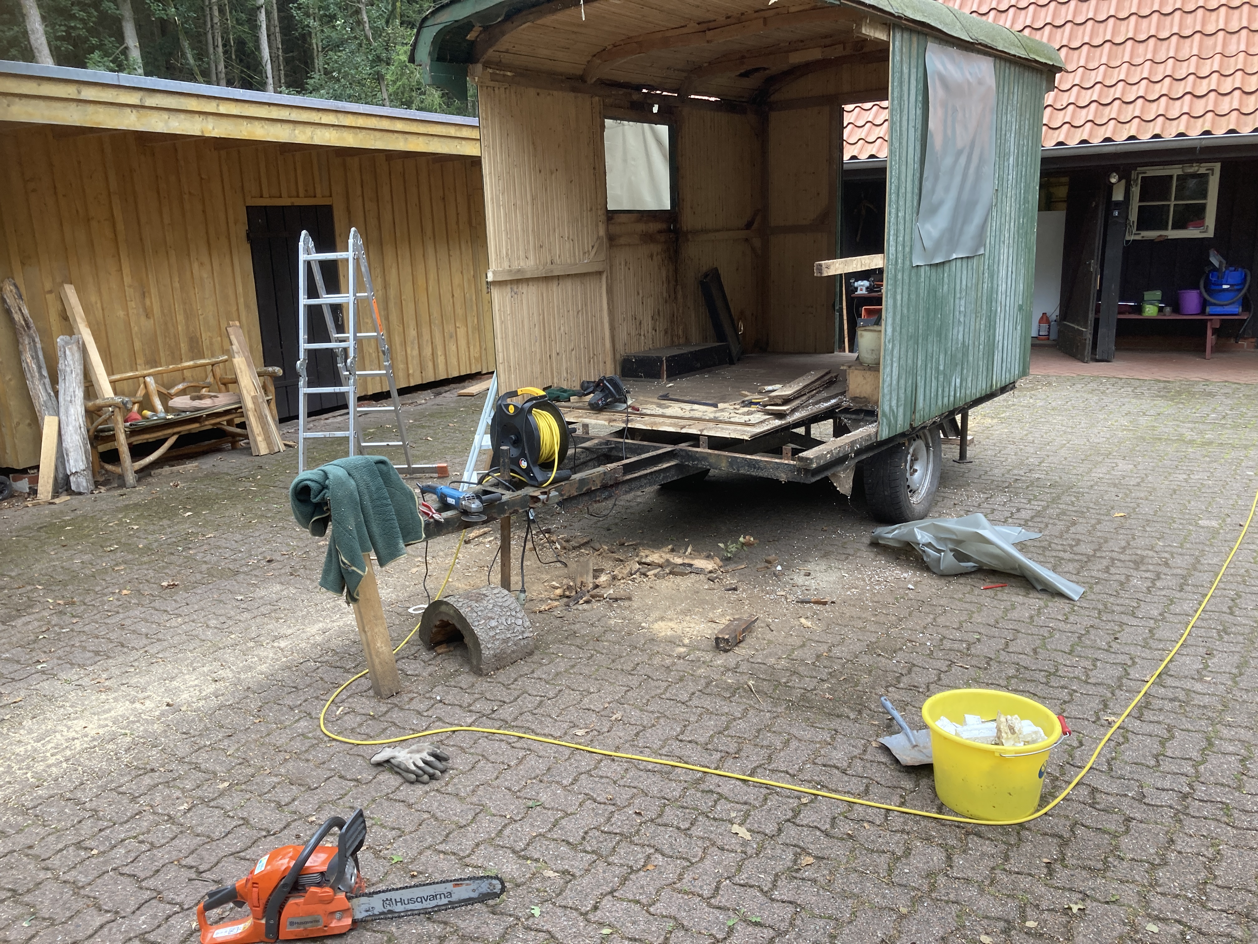 Doch nach der Ankunft im Heide-Häuschen wurde schnell klar: Eine Entkernung und "Renovierung" reichte hier nicht aus. Der  Wagen war insgesamt marode, eine "Reparatur" wäre zwar möglich gewesen, aber sehr mühevoll, und sie hätte am Ende kein wirklich befriedigendes Ergebnis erbracht. Also: Abriss! Der Bauwagen wurde in der Mitte durchgesägt und entsorgt. Am Ende stand da nur noch das Basisgestell aus Stahl mit Radachse und Deichsel.