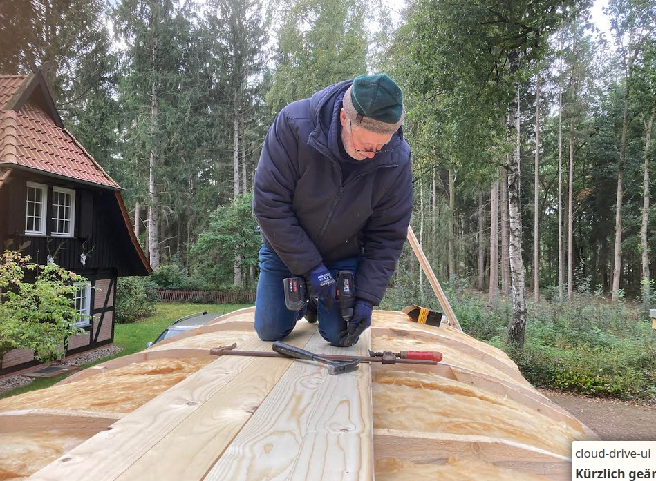 Kleine Anmerkung, um ehrlich zu bleiben: Die Fenster sind natürlich nicht selbst gebaut, sondern von OBI, die Tür hat unser Freund Jürgen maßgeschneidert, und beim Dach hat die Firma Stelter aus Müden geholfen.
