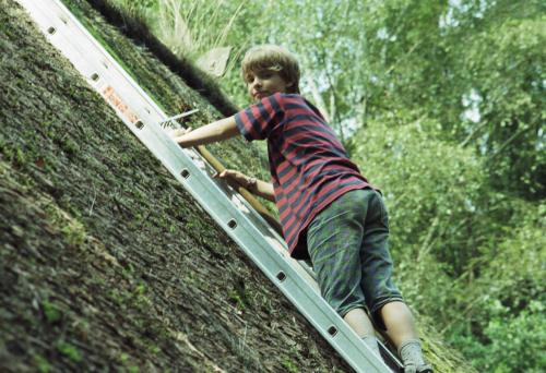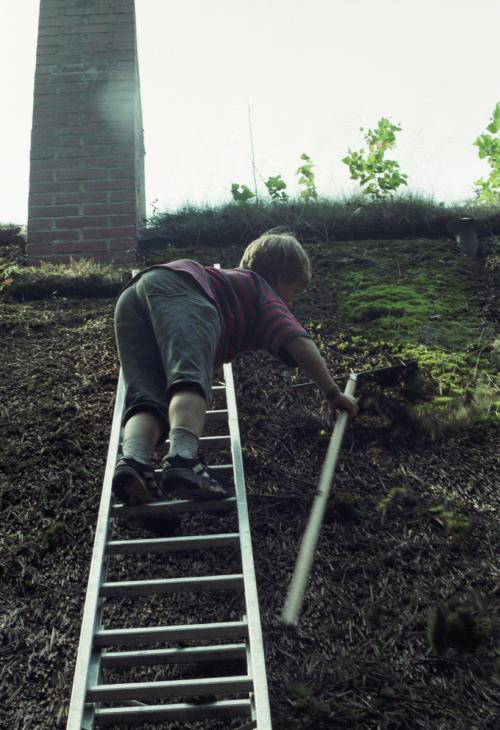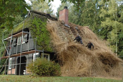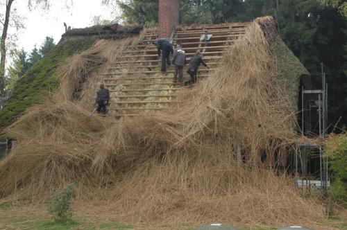 Leider ist es so, dass Reet  immer ausreichende Lüftung benötigt, um nach Regen etc. schnell wieder abzutrocknen. Das war beim Waldhäuschen mit seinen dicht am Haus stehenden Baumbeständen nicht genügend möglich. Moos bildete sich und musste immer wieder vom Dach gekratzt werden (siehe Bild), aber das Dach blieb dennoch feucht, das Reet zerfiel.